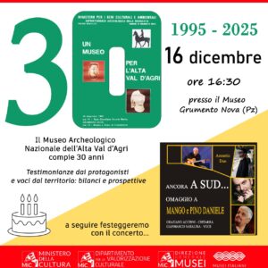 Martedì 16 dicembre 2025 il Museo archeologico nazionale dell’alta Val d’Agri compie 30 anni dall’inaugurazione. Il Museo, insieme al Parco archeologico di Grumentum, rappresenta il punto di…